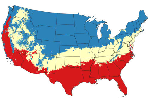 The location of the ranch will be used to place the cattle in cool season (blue), warm season (red) or transitional (yellow). Then the corresponding NDF value used will be an average of grasses occuring in that area.