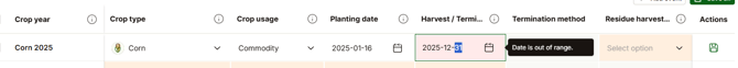 - Input the planting and harvest dates either manually or using the date picker (select the calendar icon).