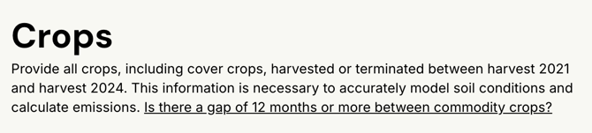 It is advisable to input your crop data before addressing any of the subsequent stages. This will ensure that the crop and crop year date range is accurately recorded, allowing for a label that is clearly displayed in the subsequent stages.