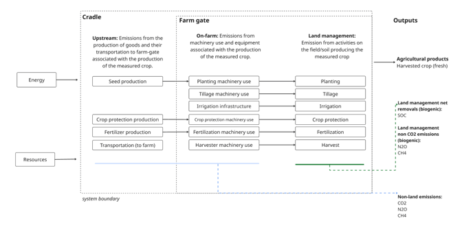 This inventory methodology quantifies cradle-to-farmgate emission factors associated with the production of a measured crop on agricultural land. Emissions quantified include CO2, CH4, and N2O (with CO2e conversions) that are within the system boundary.